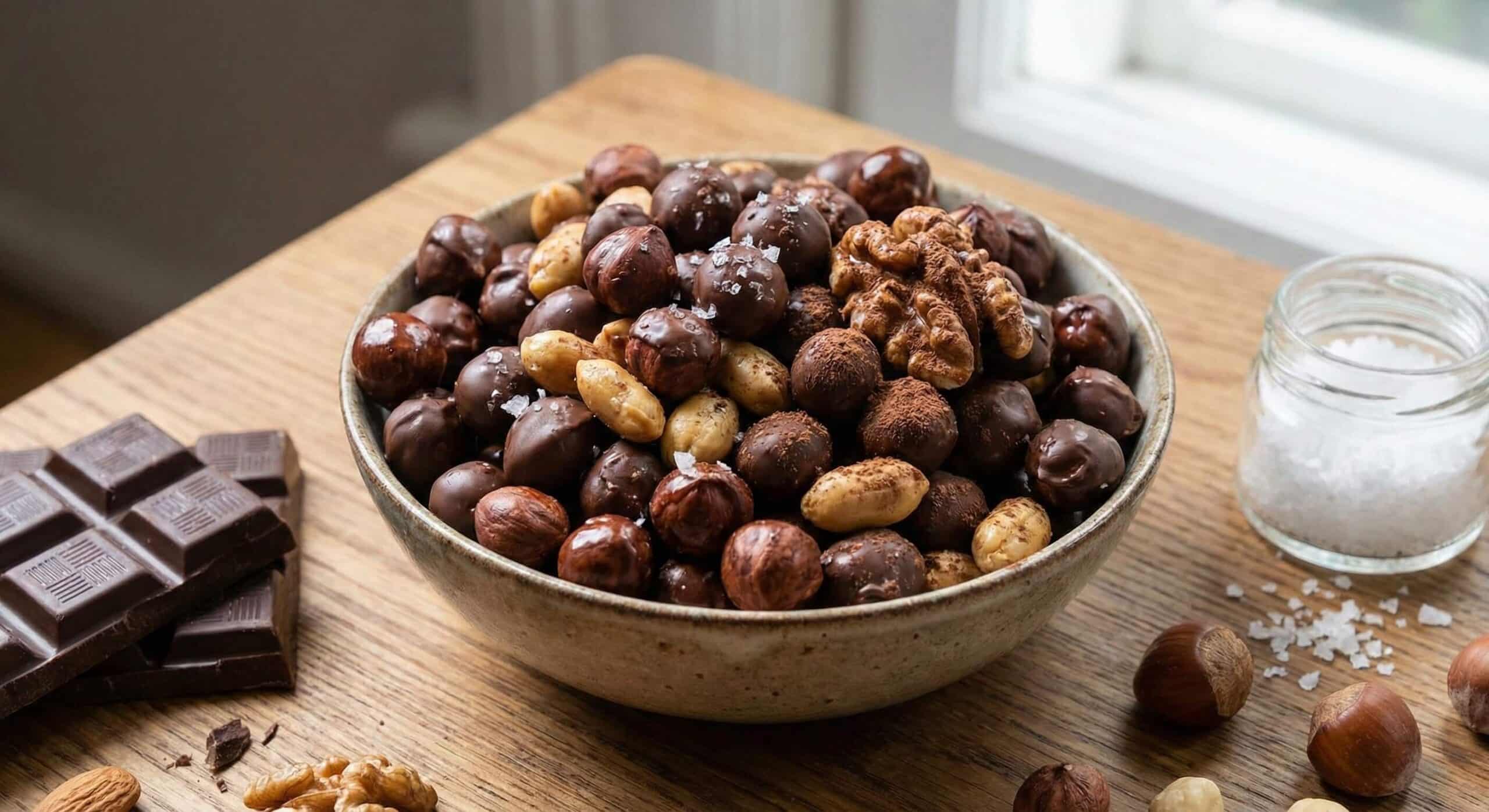 Bądźmy szczerzy – temperowanie w domu bywa kapryśne. Jeśli Twoja czekolada zastyga, ale jest matowa, ma smugi albo biały nalot – nie panikuj. Wrzuć orzechy (zanim czekolada zastygnie na kamień) do miski z ciemnym kakao lub cynamonem i potrząśnij. Proszek idealnie pokryje wszystkie niedoskonałości. Takie „trufle” wyglądają bardzo elegancko, rustykalnie i smakują wybornie, a nikt nie domyśli się, że coś poszło nie tak. To świetna opcja na przykład na orzechy w gorzkiej czekoladzie, gdzie gorycz kakao pasuje idealnie.
